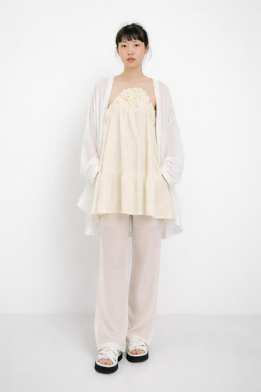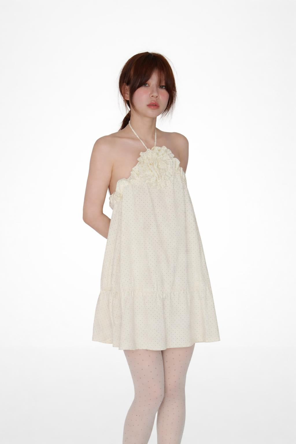 [Freckle] 2025 Summer Polka Dot Halter Dress with Floral Brooch – Sweet High-Waisted Slip Dress