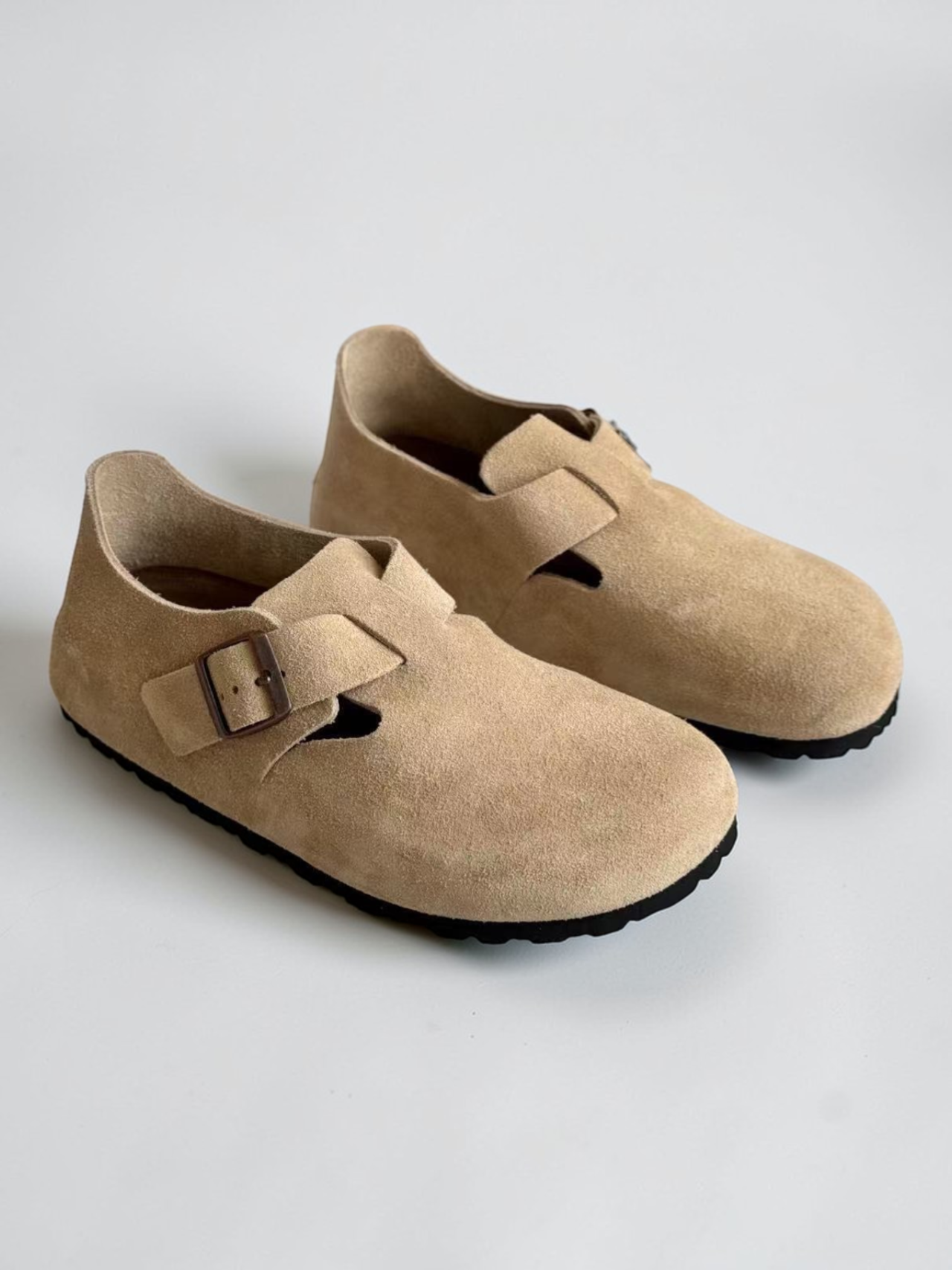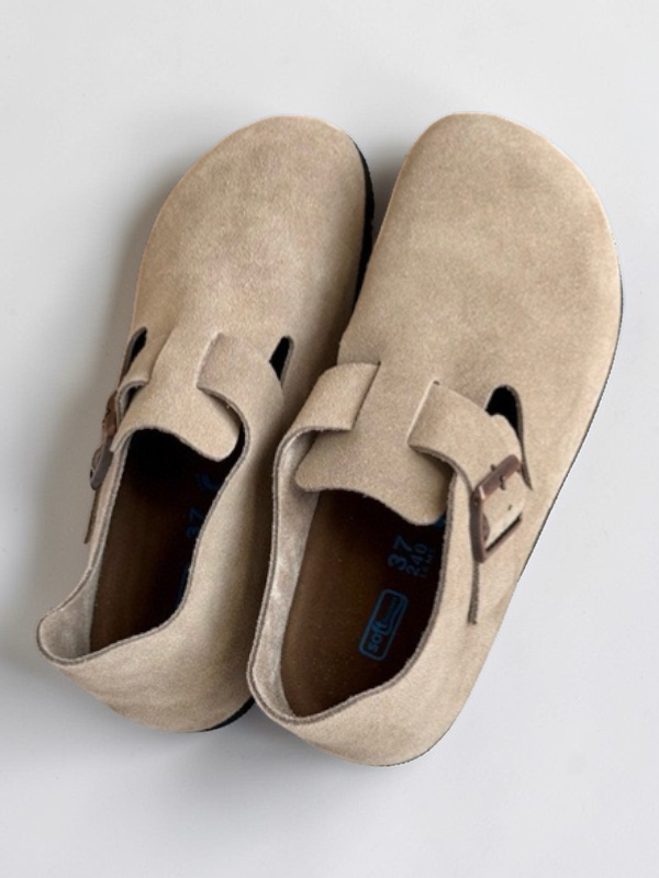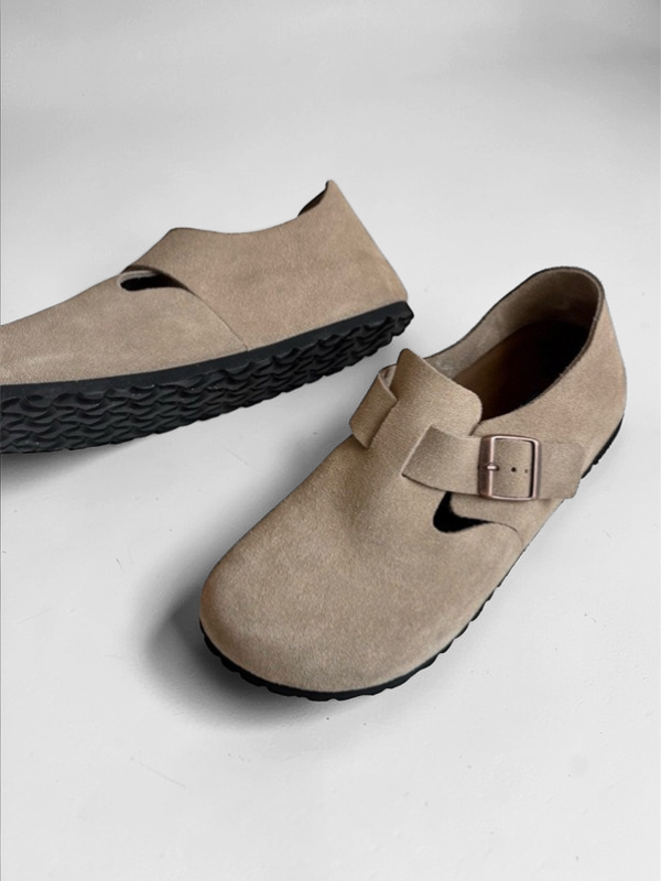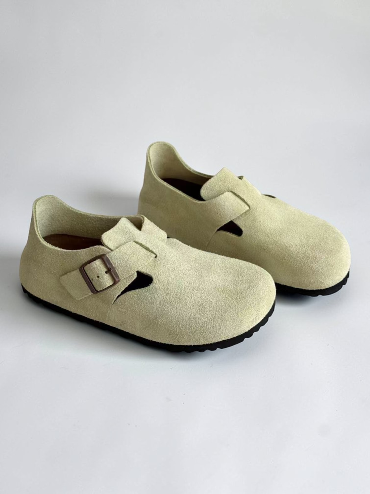 The natural cork-inspired base moulds gently to the foot over time, offering lightweight cushioning and support. With a closed round toe and slip-on design, these versatile flats are easy to style with casual outfits, linen sets, or relaxed summer tailoring.