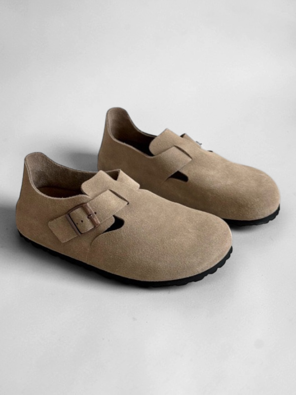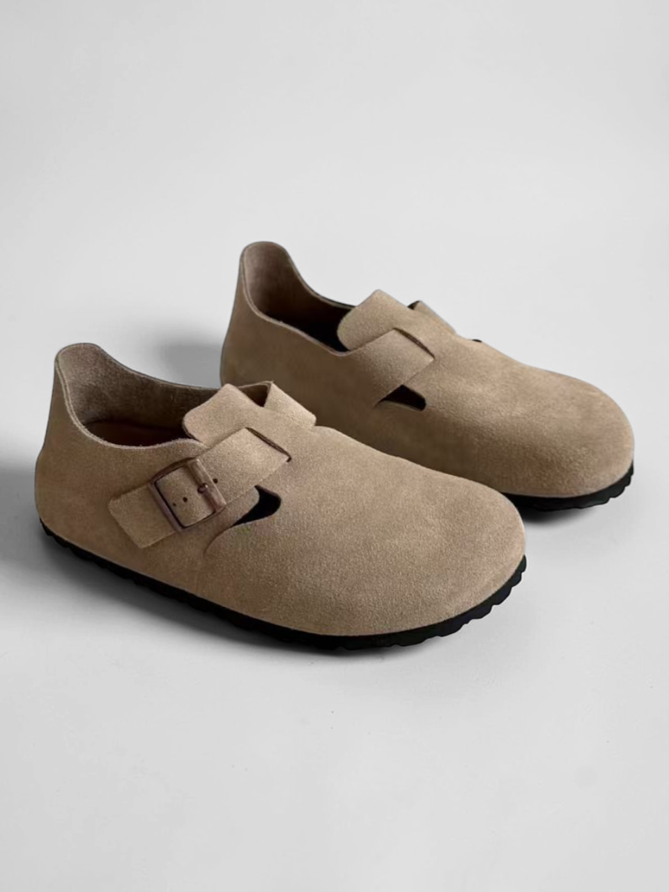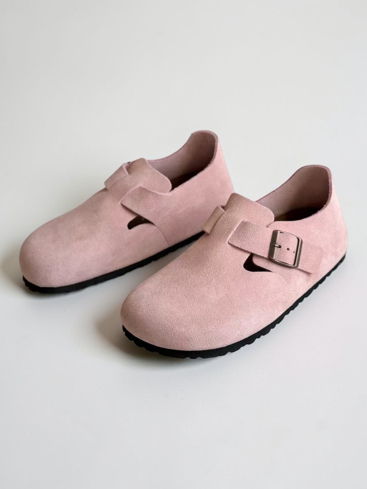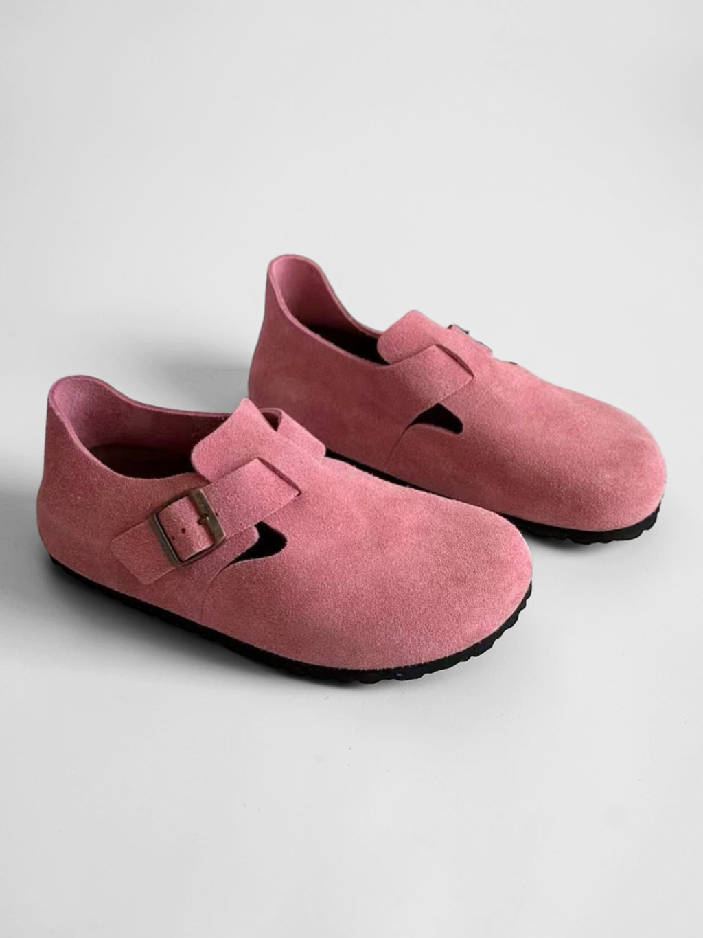 The natural cork-inspired base moulds gently to the foot over time, offering lightweight cushioning and support. With a closed round toe and slip-on design, these versatile flats are easy to style with casual outfits, linen sets, or relaxed summer tailoring.