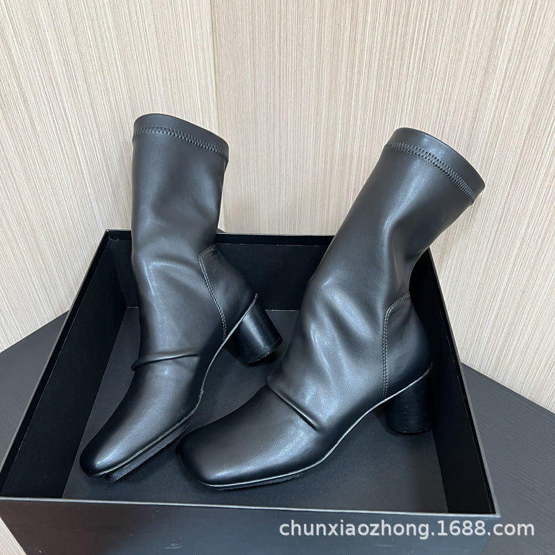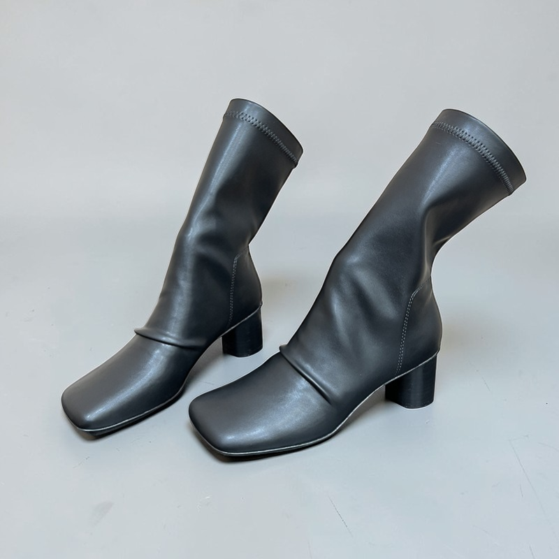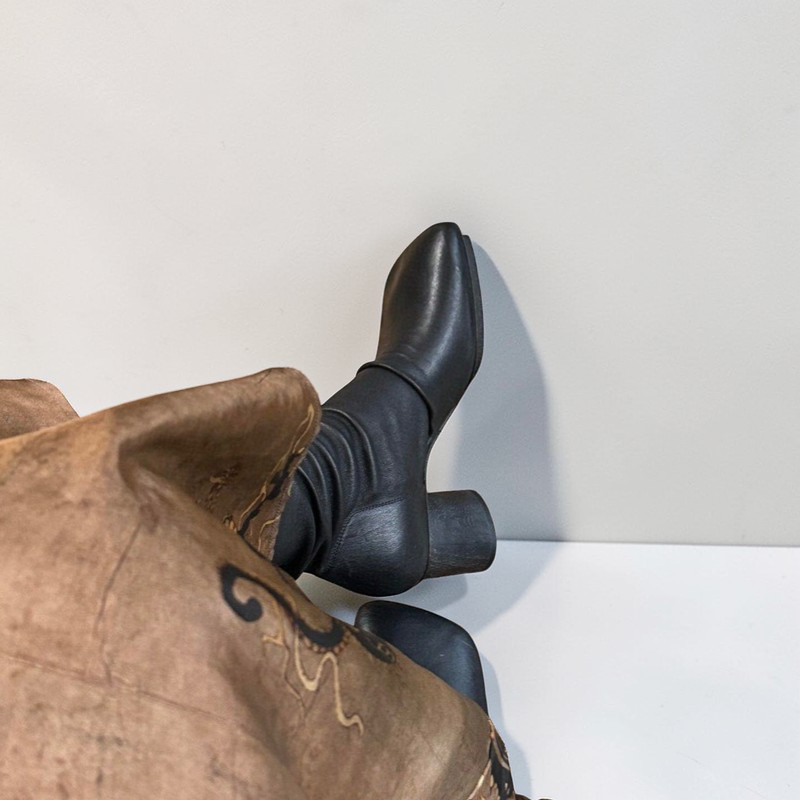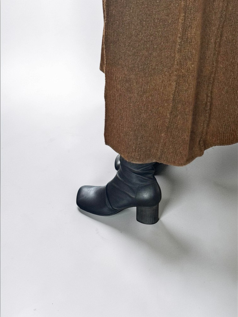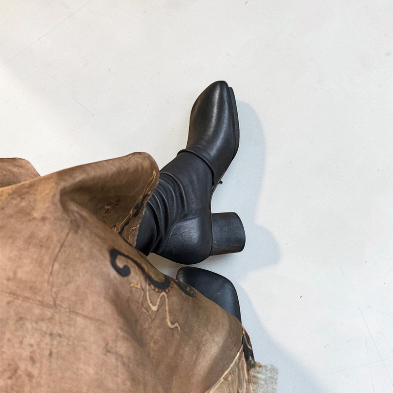 A modern statement boot with a vintage edge, these square toe slouch boots bring together soft structure and effortless style. Designed with a sculpted mid-calf silhouette and relaxed stacked shaft, they create a flattering elongated look while remaining comfortable for everyday wear.