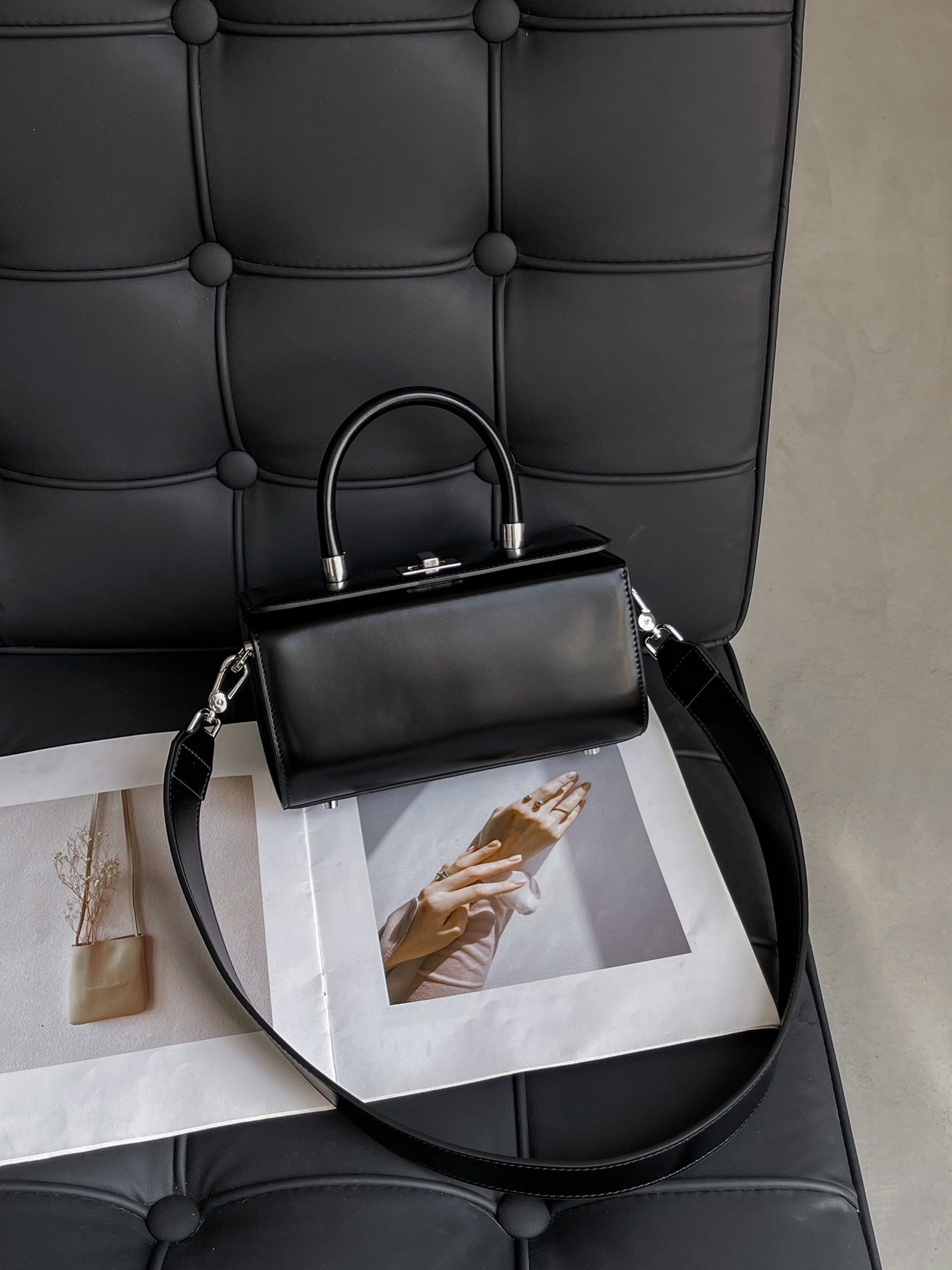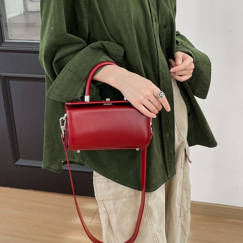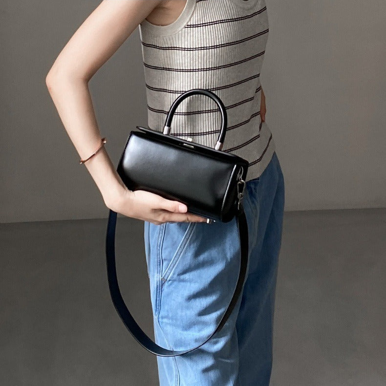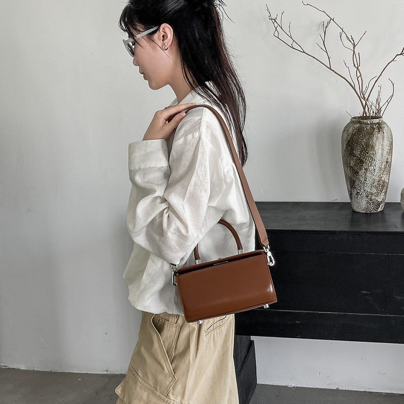 Genuine Leather Box Bag – Small Shoulder & Crossbody Handbag with Wide Strap
