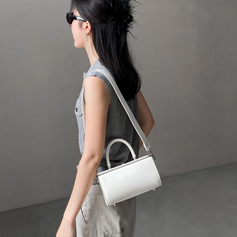 Refresh your wardrobe with this Summer designer box bag, a minimalist yet statement-making everyday essential. Crafted from premium two-layer cowhide leather with a structured horizontal silhouette, this small handbag features clean lines and modern street-style flair. The top handle allows for handheld carrying, while the included wide shoulder strap offers comfortable shoulder or crossbody wear — perfect for daily outfits, brunch dates, or city strolls. Inside, a central compartment and zipper pocket organiser keep essentials like your phone, wallet, and keys neatly in place. Available in versatile colours — White, Black, Red, Apricot, and Coffee — this fashion-forward box bag pairs effortlessly with both casual and contemporary looks.