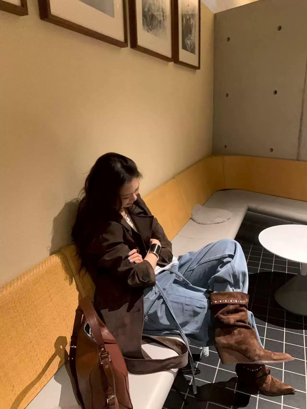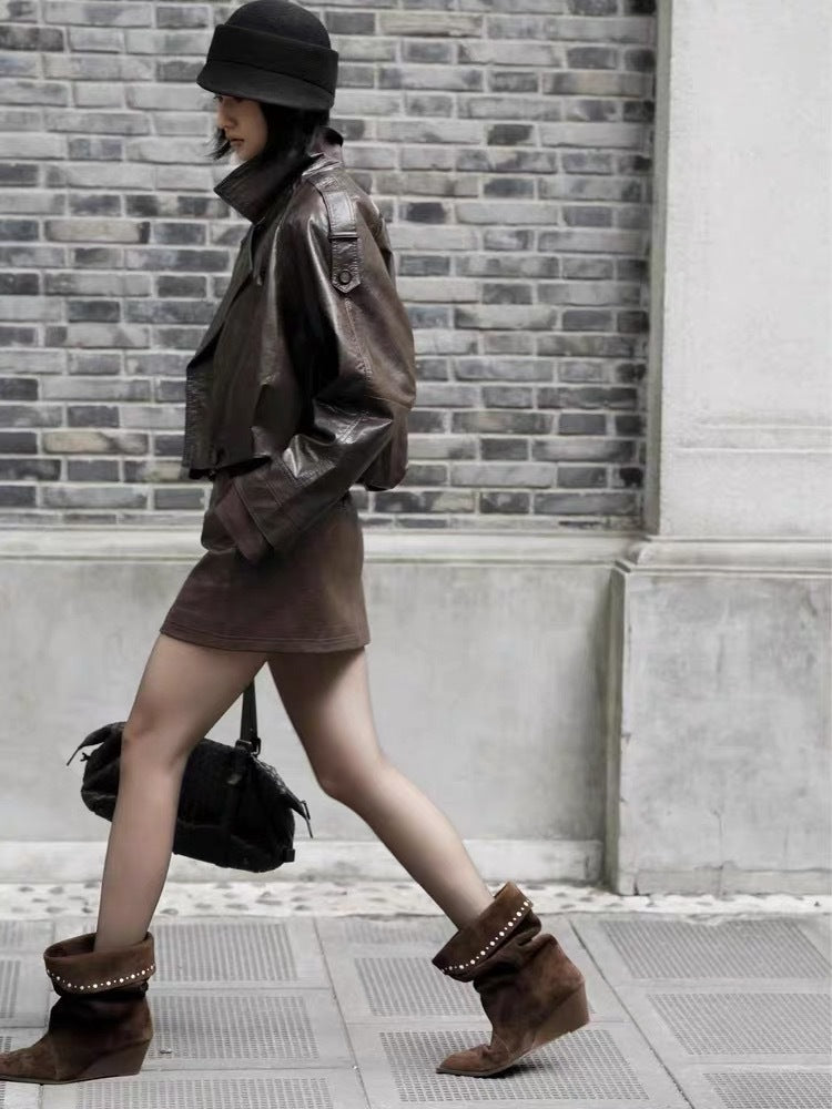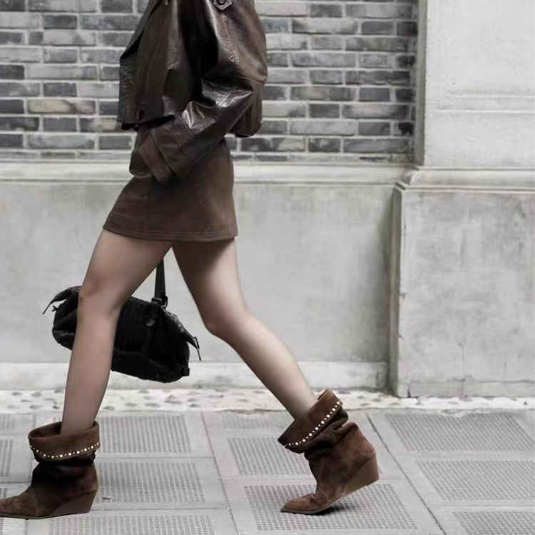 Crafted from soft suede leather with a comfortable sheepskin lining, these boots provide warmth and breathability while maintaining a lightweight feel. The hidden wedge heel subtly elevates the silhouette while offering stable everyday wear.