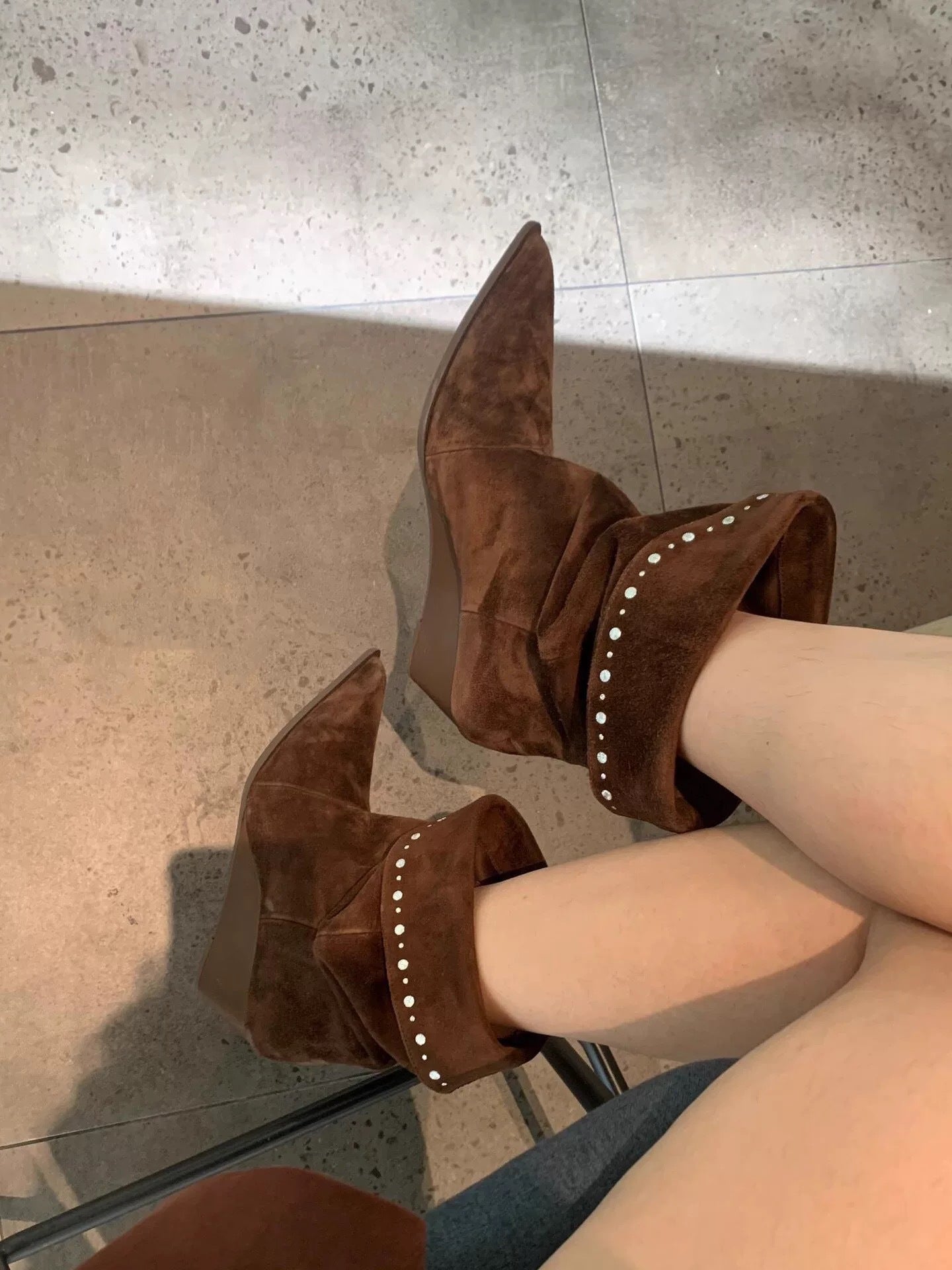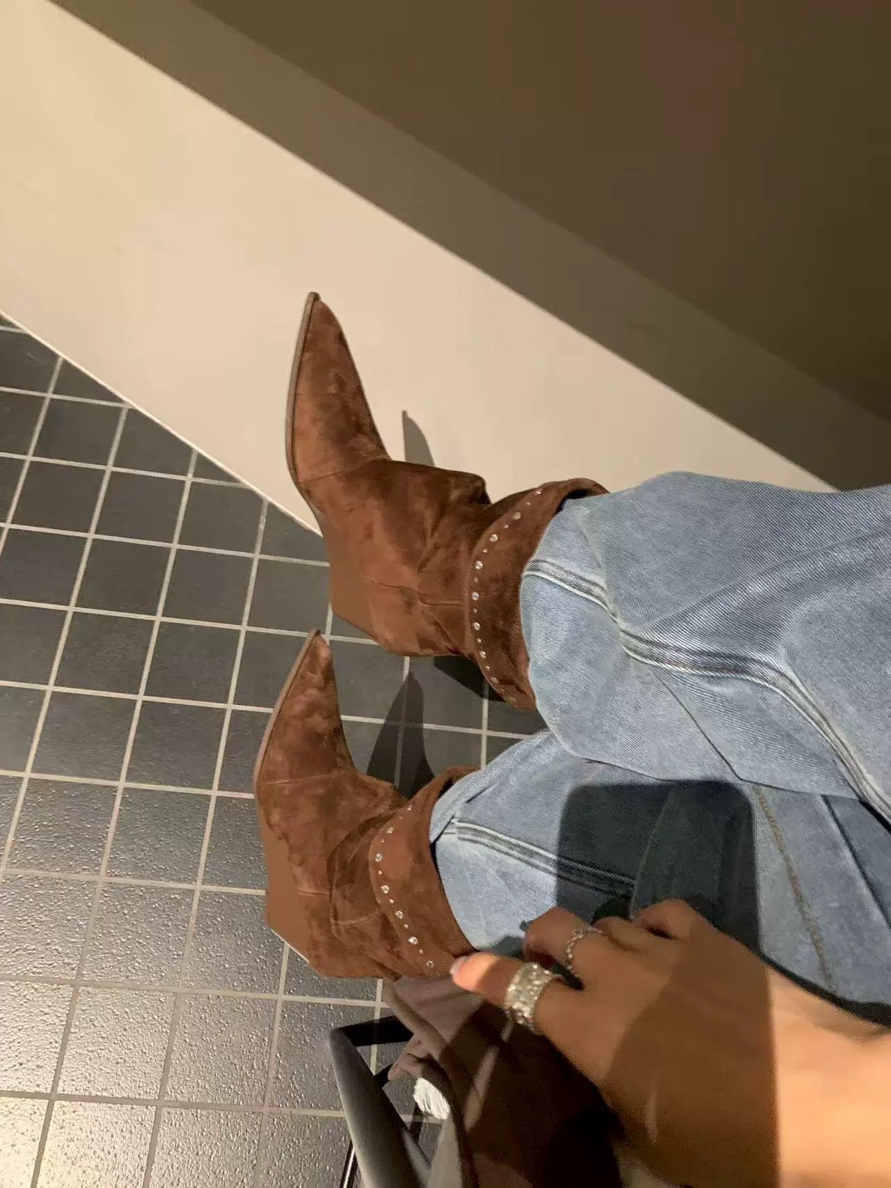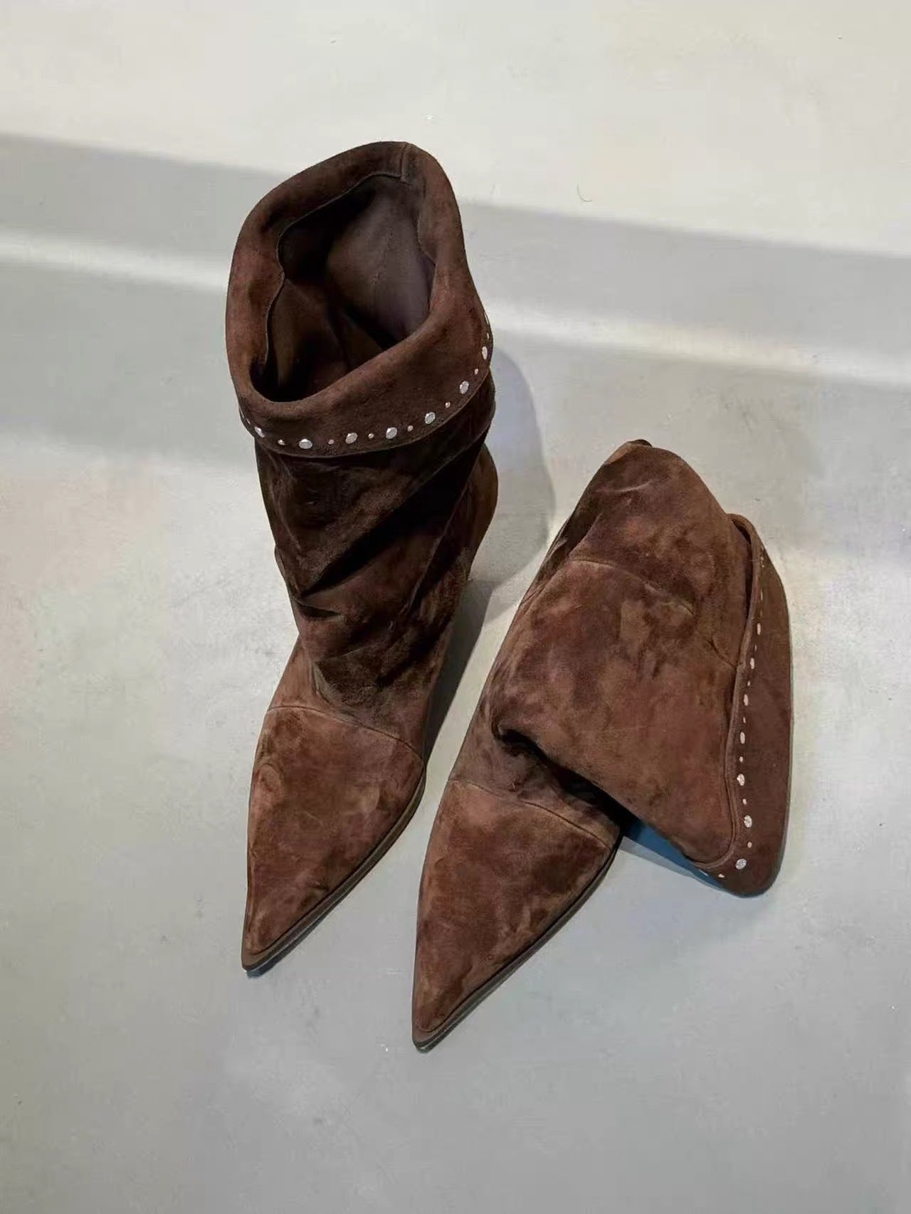 These distinctive western slouch boots blend bold cowboy influence with modern fashion-forward design. Featuring a sleek pointed toe and softly gathered shaft, they create a relaxed stacked silhouette that adds character to autumn and winter outfits.