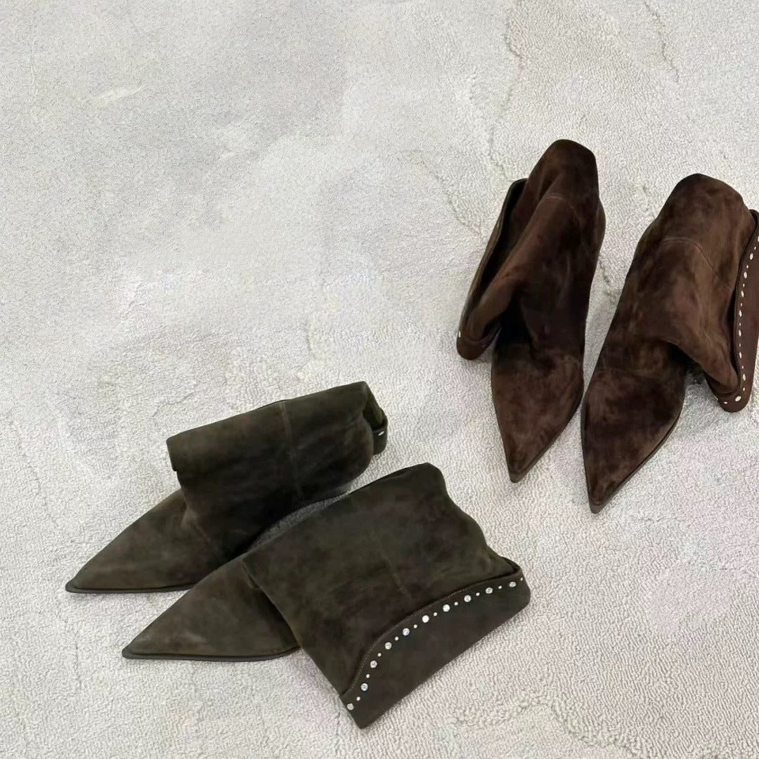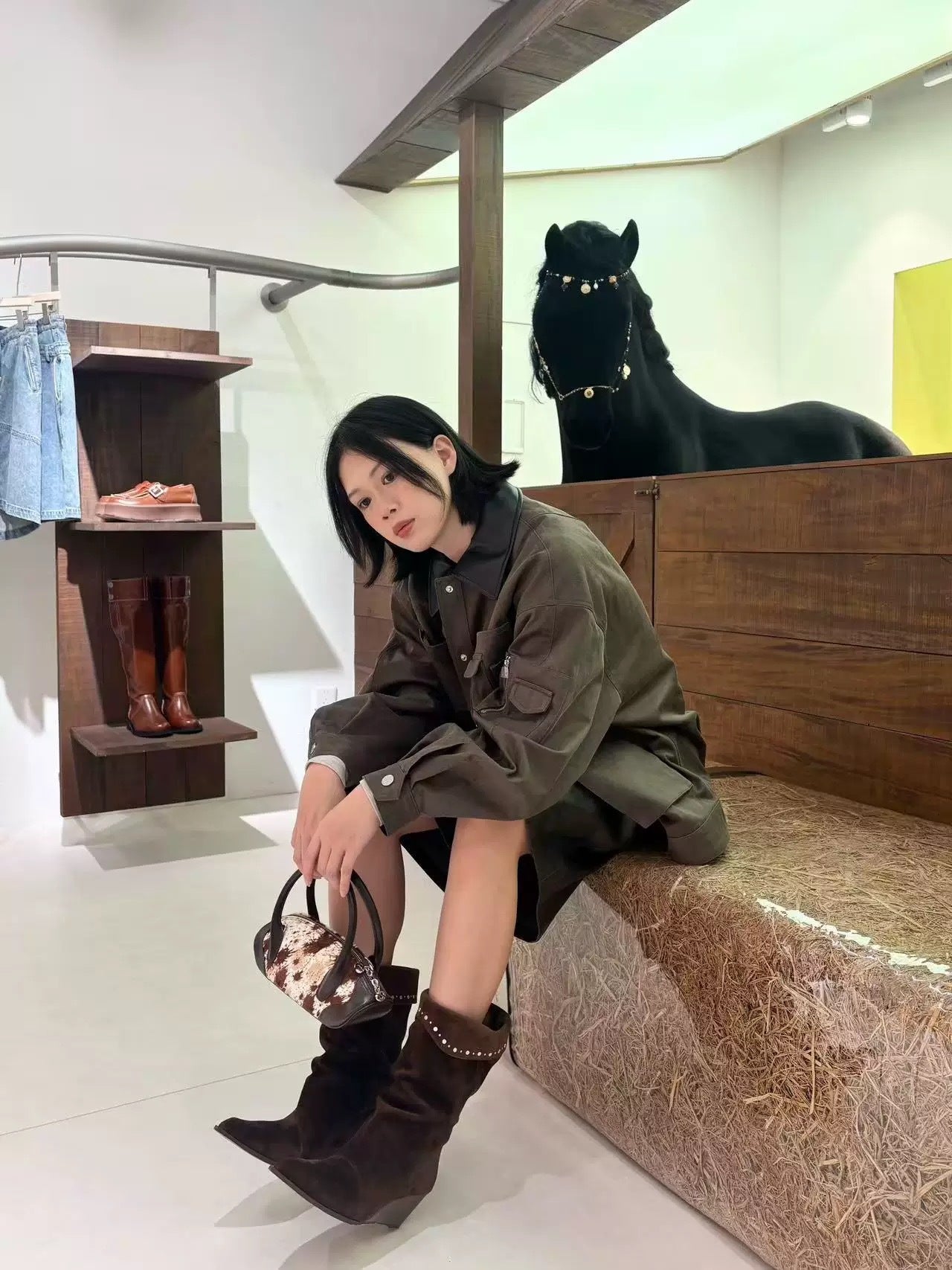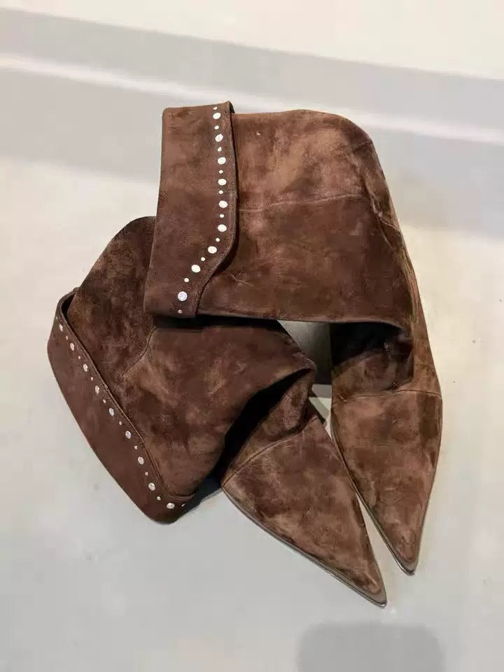 These distinctive western slouch boots blend bold cowboy influence with modern fashion-forward design. Featuring a sleek pointed toe and softly gathered shaft, they create a relaxed stacked silhouette that adds character to autumn and winter outfits.
