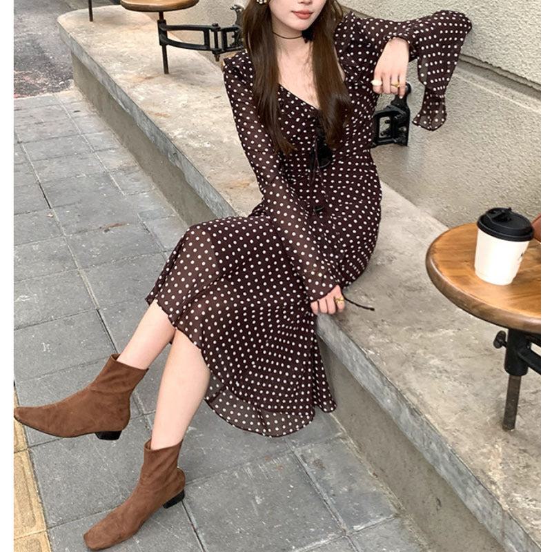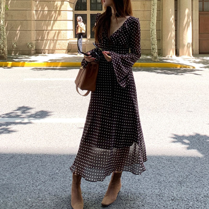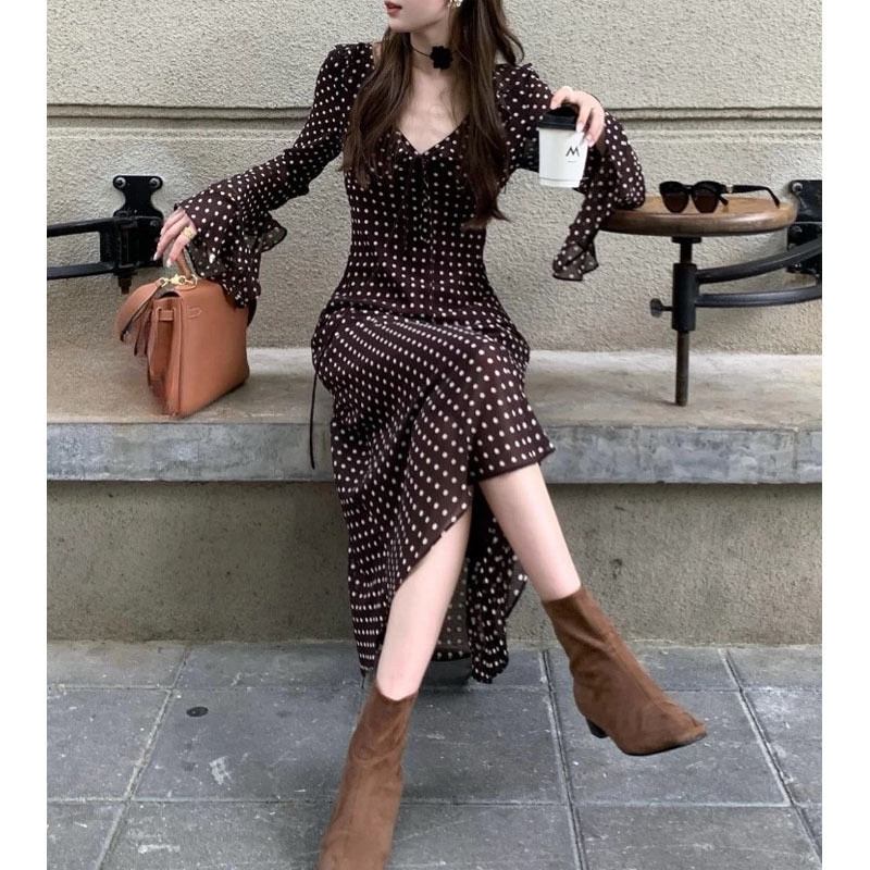 Introducing the Autumn Temperament Polka Dot Dress — a feminine and refined single-piece silhouette that blends classic retro art with modern elegance. This long sleeve A-line dress features a flattering V-neck framed with delicate fungus edge (ruffle) details that add gentle visual interest without overwhelming the design. The high waist cut elongates your figure, while horn sleeves bring a soft, sculptural shape to the silhouette. Crafted from a premium cotton-polyester blend with excellent drape and resilience, this dress feels comfortable and elegant for daily wear, travel, or special occasions.