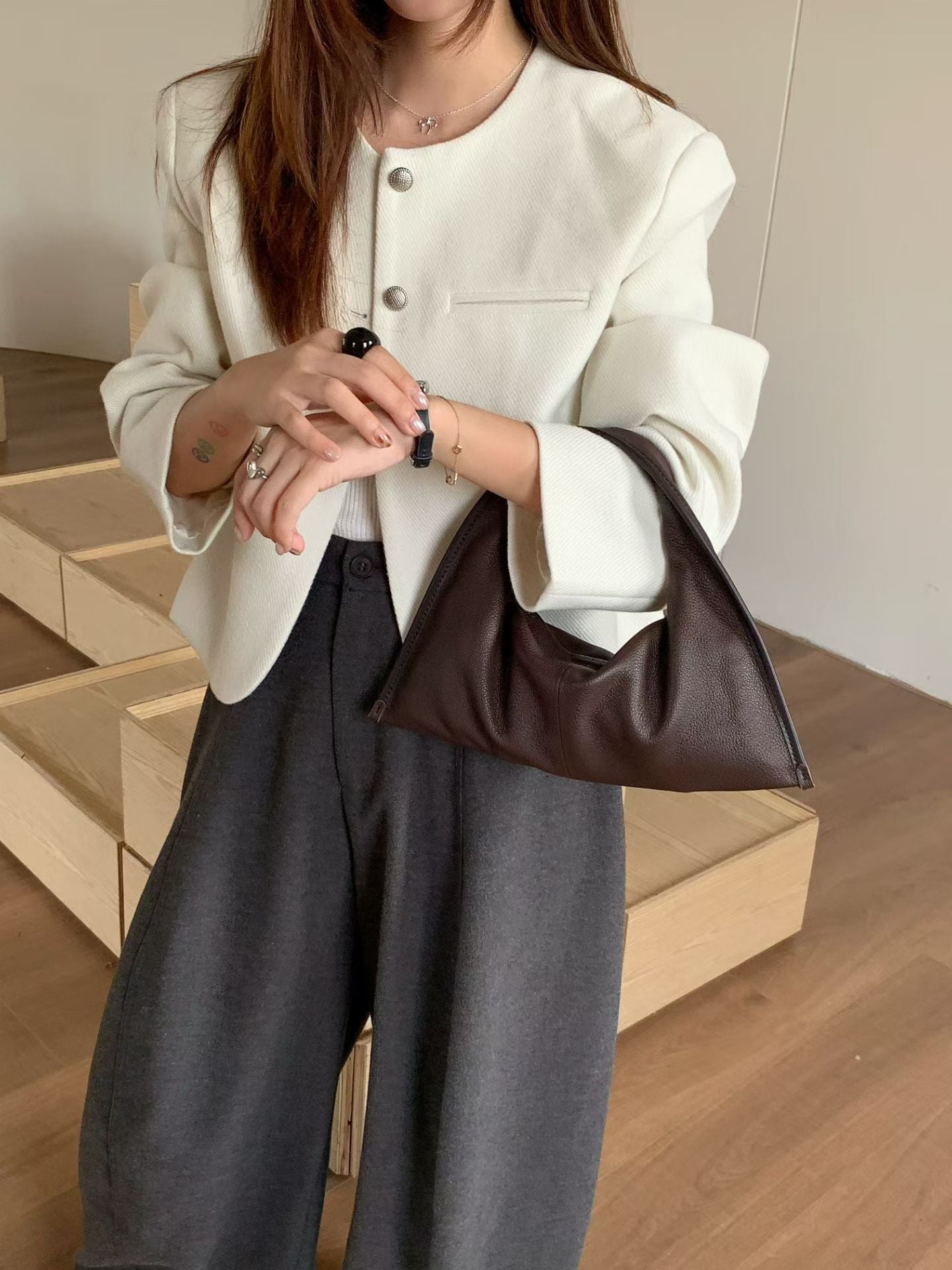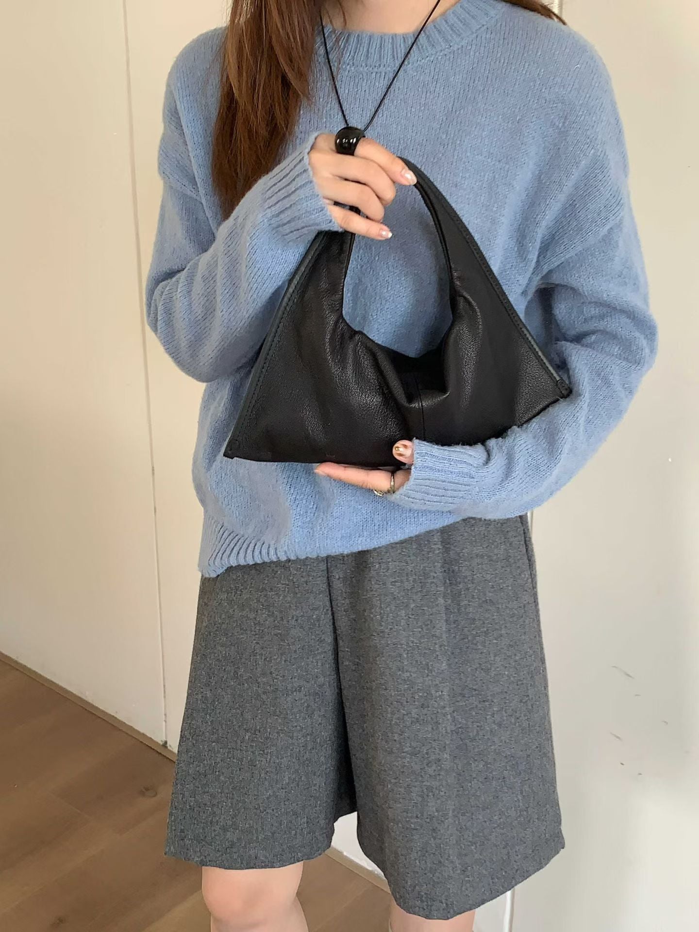 Elevate your daily wardrobe with this Sheepskin Triangle Bag — a chic and understated accessory crafted from premium genuine sheepskin leather, known for its soft texture and luxurious feel. The unique triangle silhouette blends minimalist aesthetics with refined construction, creating a statement piece that pairs beautifully with casual streetwear or elevated city styles. With a structured base of approximately 33 cm and a height of 17 cm, this bag offers roomy capacity while maintaining a sleek profile. The open top secures with a magnetic clasp, giving you easy access to your essentials. Inside, a thoughtfully placed zippered pocket keeps smaller items like keys or cards organised and secure. Designed for versatility, this bag can be carried by hand, worn over the shoulder, or styled as a crossbody with its long strap (if provided). Offered in classic Black, White, and Blue colourways, its clean lines and minimalist charm make it a perfect accessory for daily matching with everything from jeans and boots to knitwear and dresses.