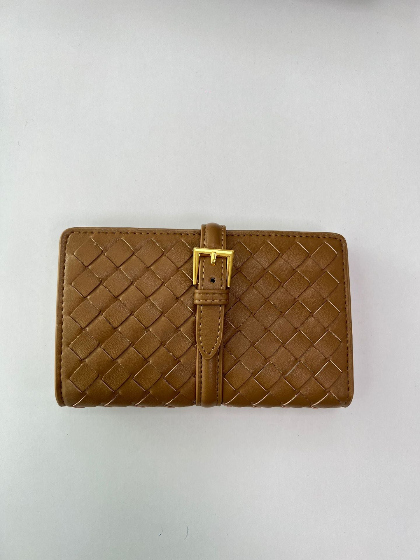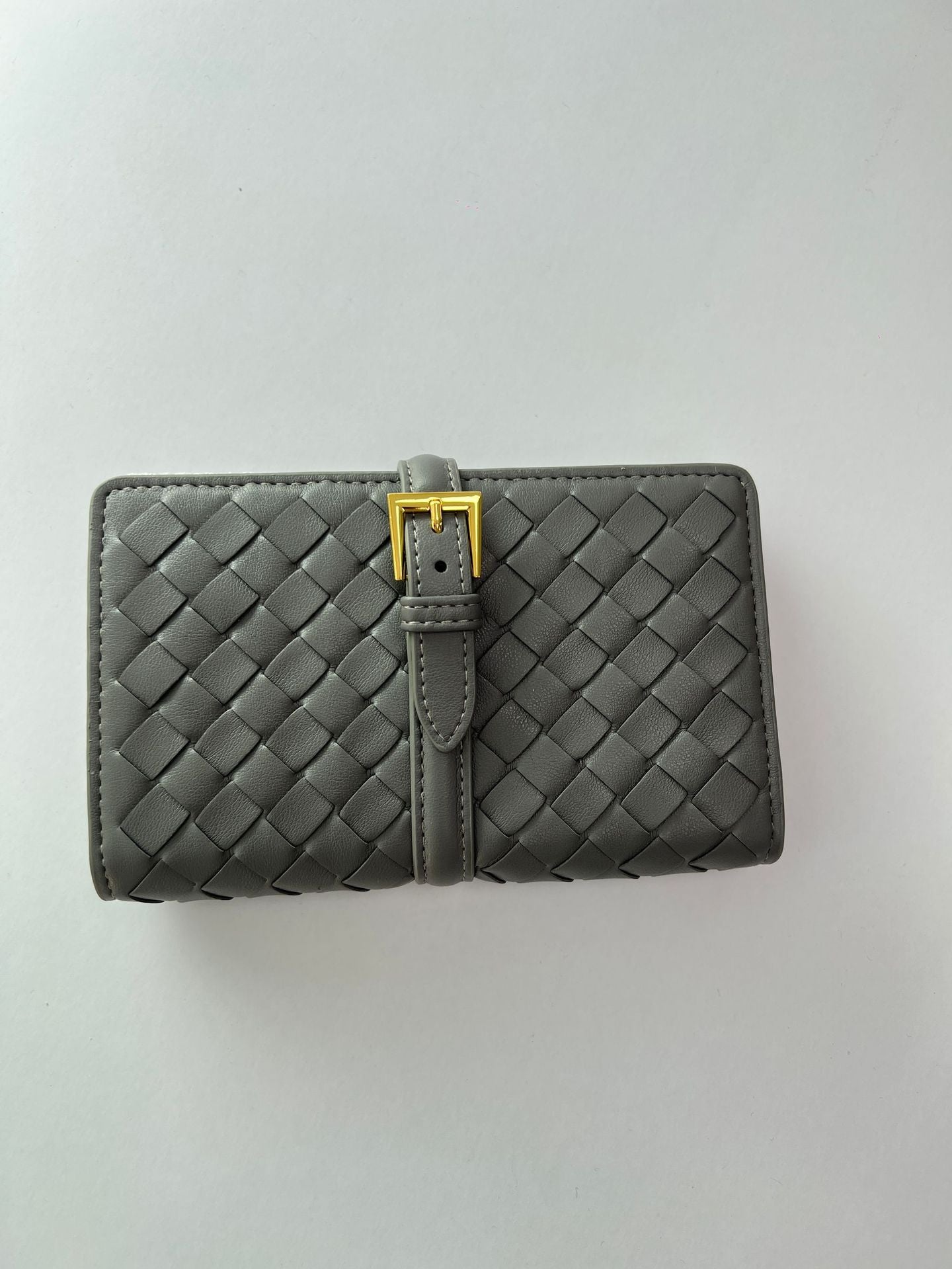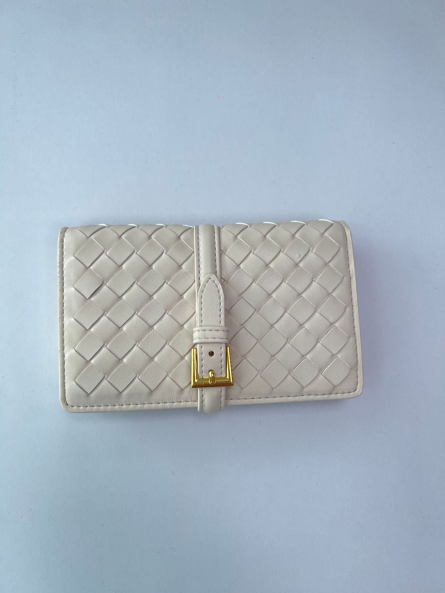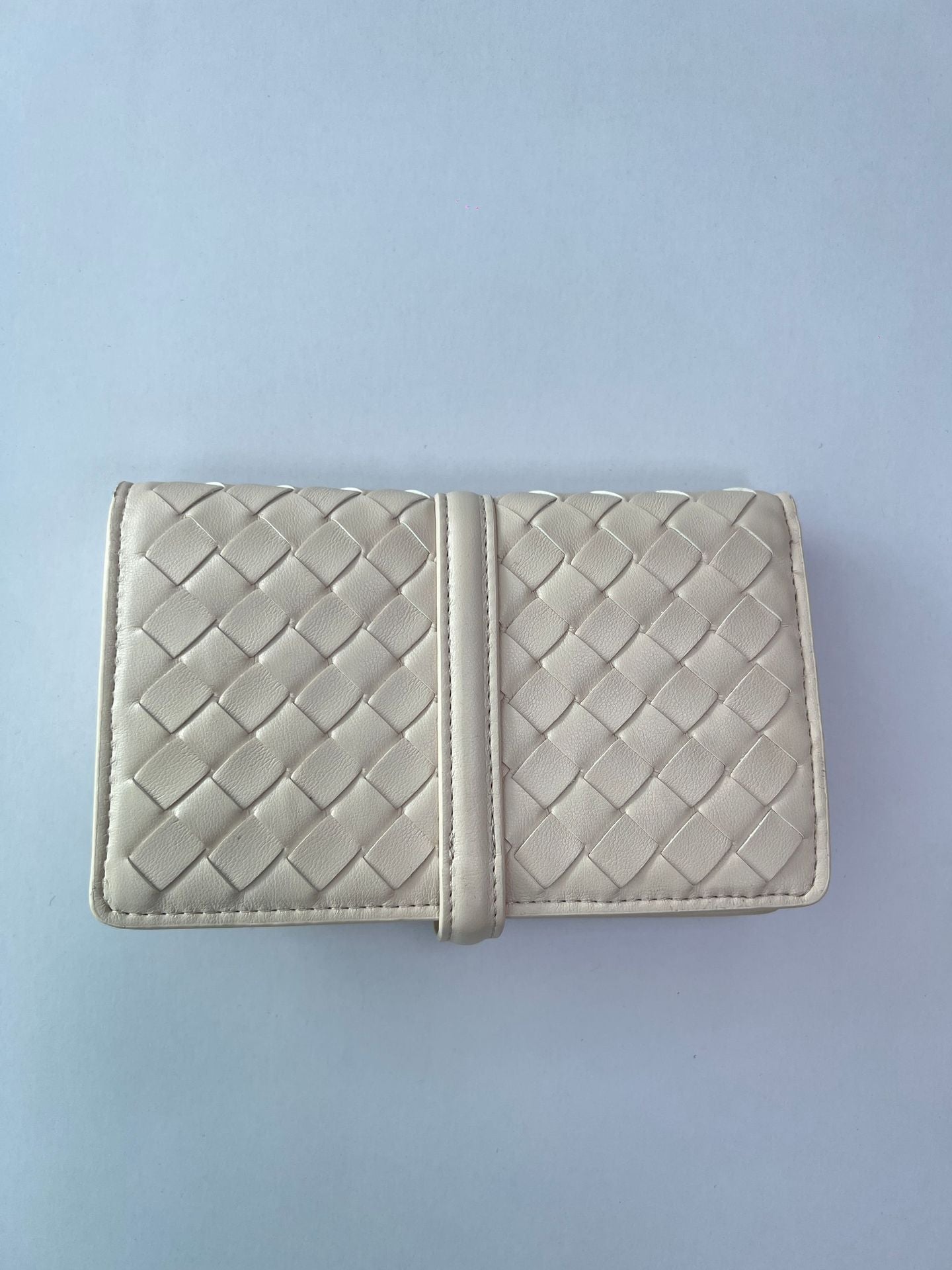 Material: Woven weave (could be leather or woven fabric) | Lining: Matching woven / textile | Closure: Foldover two-fold design