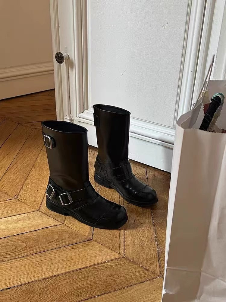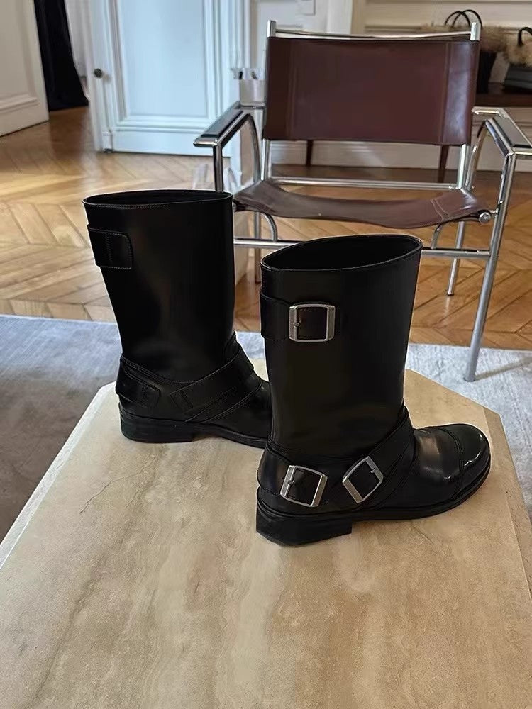 Belt Buckle Mid-Calf Knight Boots – Black Two-Layer Cowhide